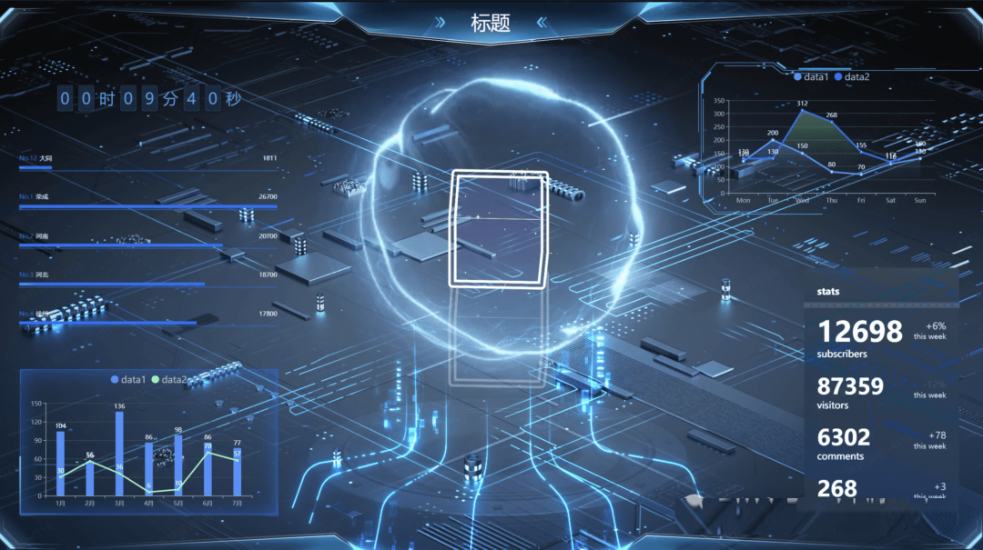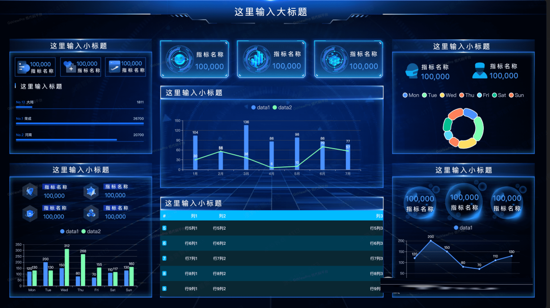 用户只需要进行简单拖拽,无需写任何代码,即可完成可视化大屏开发设计。 - 内置产品模版库
