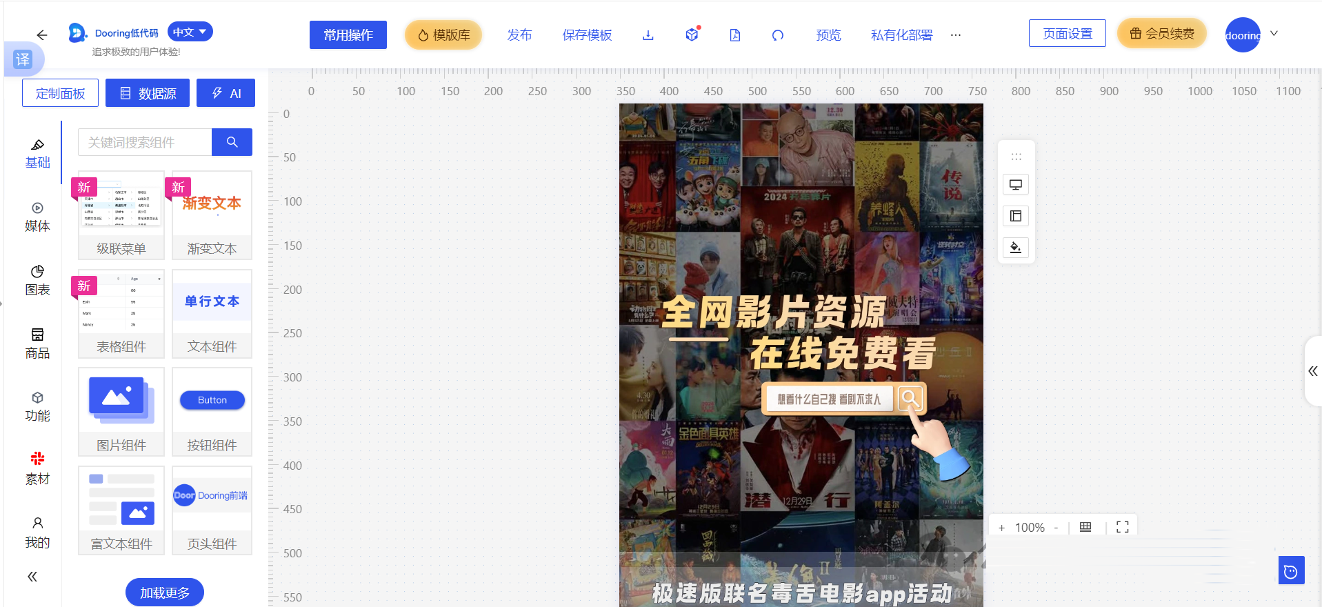 可扩展:Dooring实现了较为完整的业务闭环,并使其模块化,编辑器内部功能接口也全部可以对接不同服务端语言,实现了标准化接口。此外还支持自定义组件,二次开发,设计模板等能力,以满足功能和跨领域的分层需求。