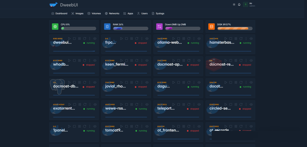 DweebUI 是一款轻量级Docker 容器管理工具,通过可视化 Web 界面实现“零配置”操作,简化容器部署、监控及运维。其核心功能包括实时监控容器状态(运行/停止/异常)与资源使用(CPU、内存、存储、网络),支持启动、停止、重启等全生命周期管理,并提供容器日志查看和终端访问功能。内置 100+ 预配置应用模板(如 PostgreSQL、Nginx),支持一键部署,兼容 Portainer 模板格式,可自定义模板库。