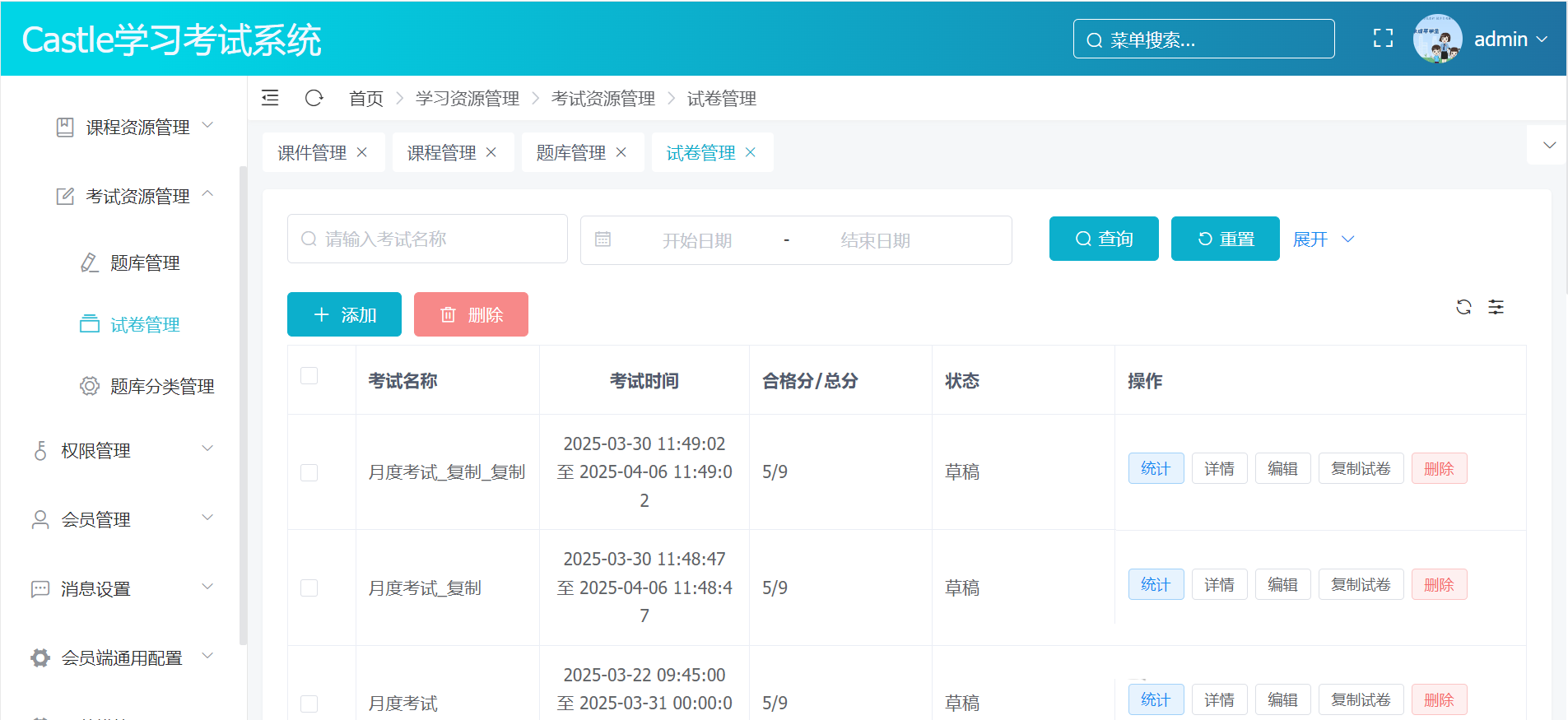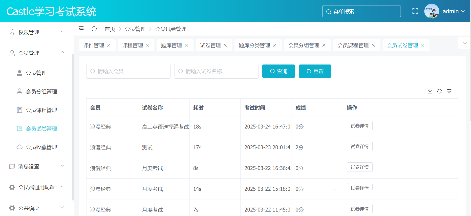 会员试卷管理:记录和管理员参加的测试和考试结果,提供成绩分析。