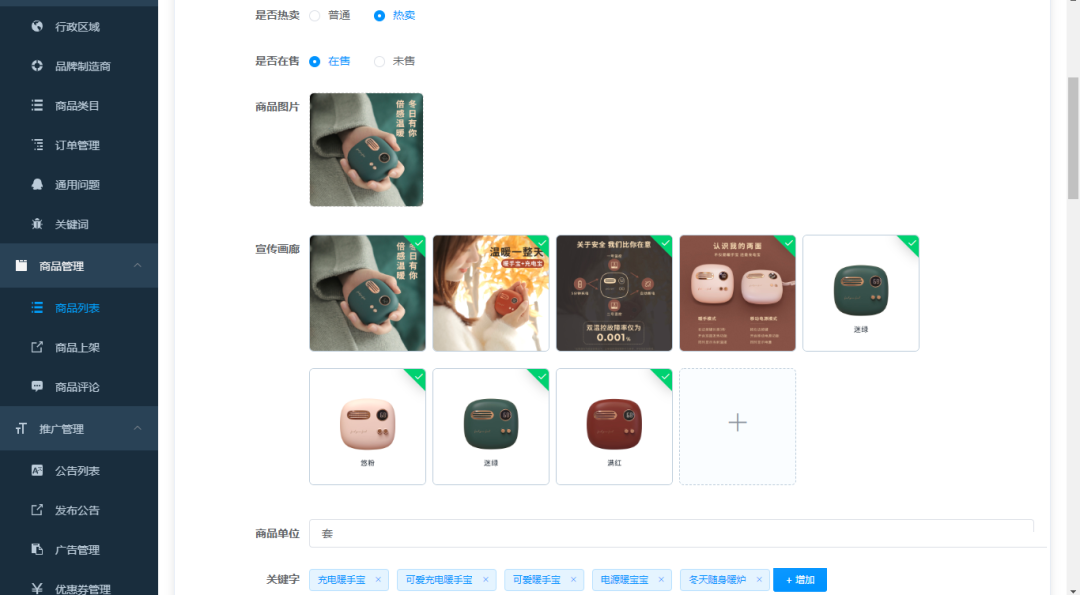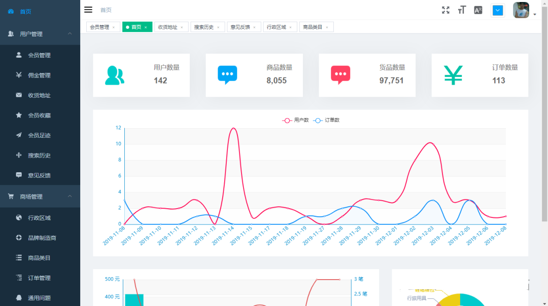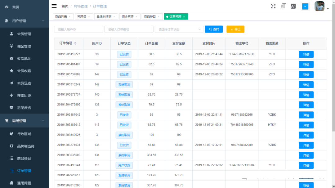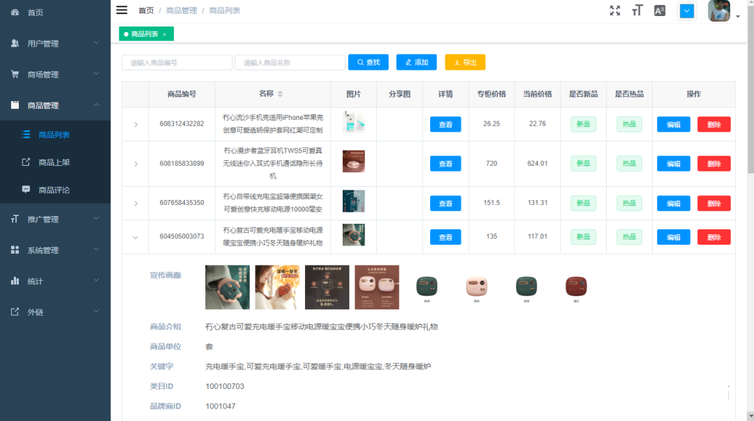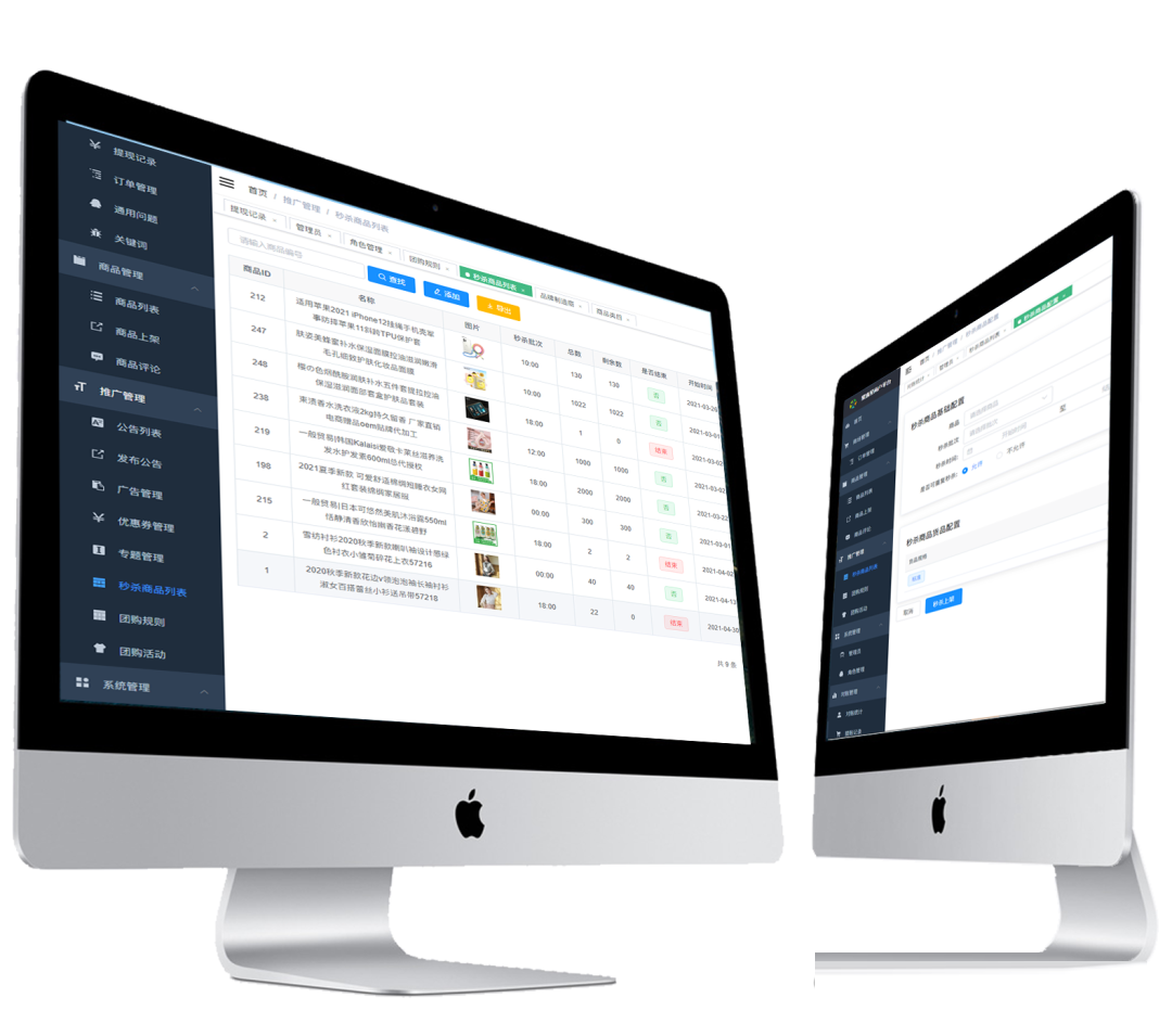 首页图表,用户管理,商场管理,商品管理,推广管理,订单管理,系统管理,统计管理,秒杀管理,参数管理,操作日志管理。