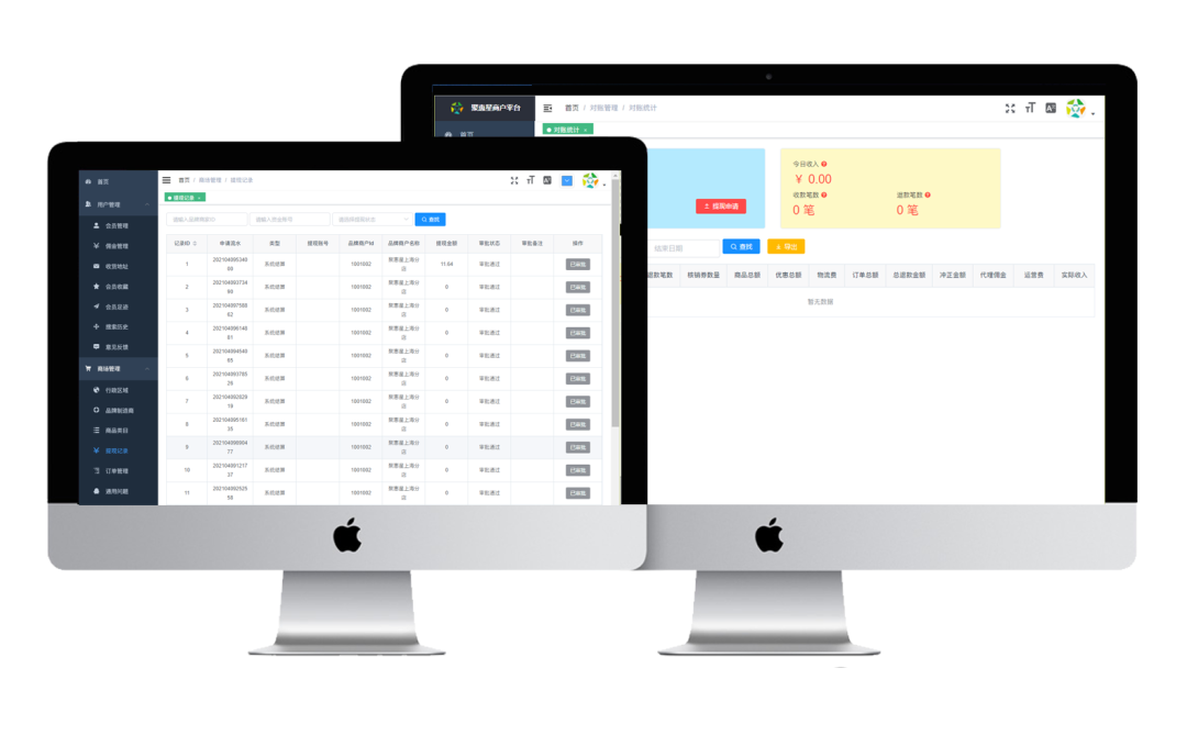 店铺申请与完善,首页图表,商场管理,商品管理,推广管理,订单管理,系统管理,团购管理,秒杀管理,对账管理。