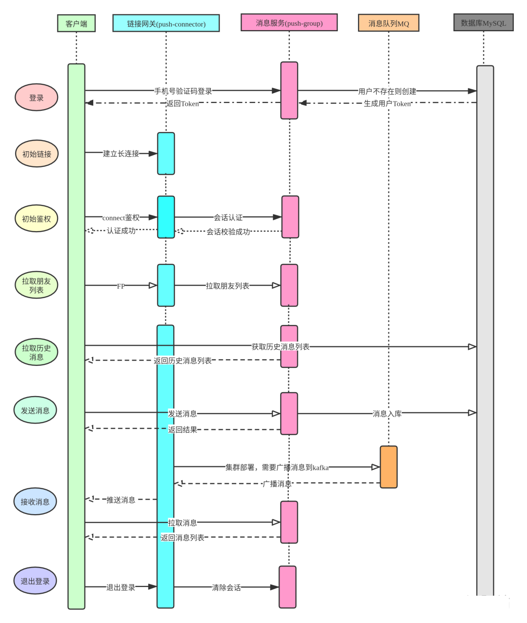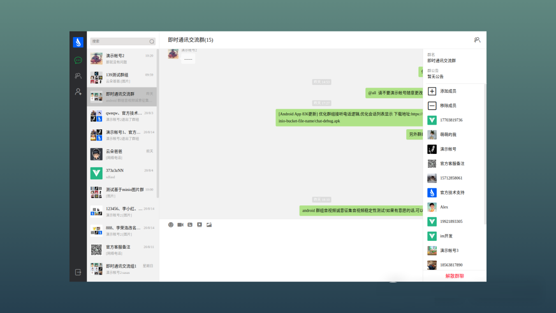 该项目即时通讯领域的热爱,并逐渐发展成为一个功能丰富的即时通讯类产品。随着功能的迭代升级,我们意识到需要暂停脚步思考一些关键问题。我们的目标是提供一个技术解决方案,而不是局限于某种编程语言或框架。例如,服务端通信框架选用了t-io(基于AIO的网络编程框架,提供了便捷的API接口,便于管理和快速部署)或Netty(基于NIO的异步网络编程框架)。此外,服务端可以使用Java或Go进行开发。我们认为,技术的根本目的在于解决问题,而非限制某一领域的发展。对于客户端应用的编写,我们支持Android、iOS以及Web平台,只要符合我们设定的交互协议规范,无论选择原生开发方式,还是跨平台开发工具如Vue、React等,都可以轻松实现。