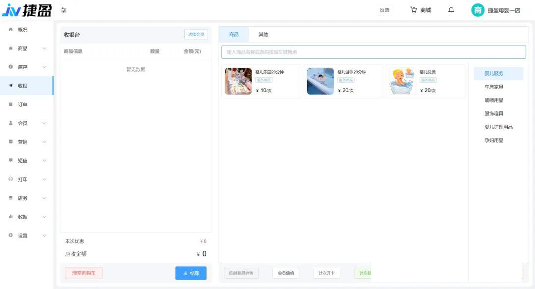 • 收银:普通商品收银,会员计次核销。