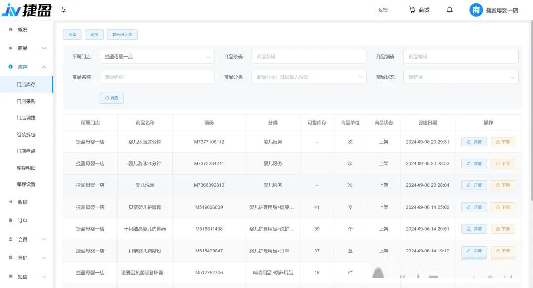 • 库存管理:包括门店库存记录,商品采购,商品调拨,组装拆包,盘点,出入库记录等功能。