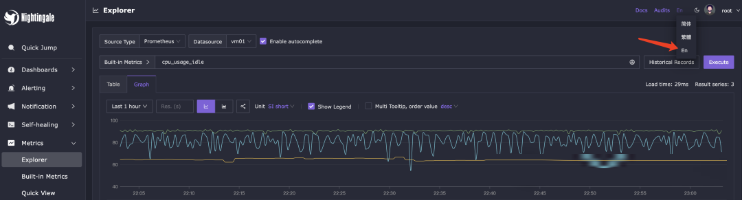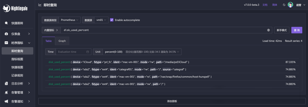 即时查询,类似 Prometheus 内置的查询分析页面,做 ad-hoc 查询,夜莺做了一些 UI 优化,同时提供了一些内置 promql 指标,让不太了解 promql 的用户也可以快速查询。