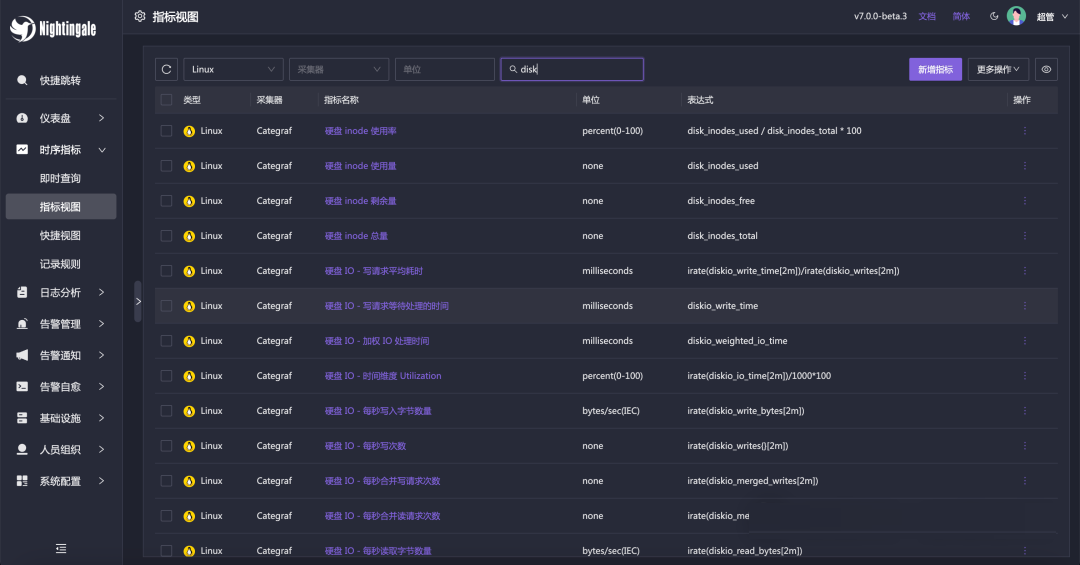 [[Pushgw]],可以配置多个时序库,即配置多份 [[Pushgw.Writers]],夜莺就会把数据同时分别转发给 Writers 中的地址),夜莺把数据转存到时序库(此处以 VictoriaMetrics 举例,也可以写入 Prometheus 等其他时序库),之后把 VictoriaMetrics 作为一个数据源接入夜莺。四、UI展示