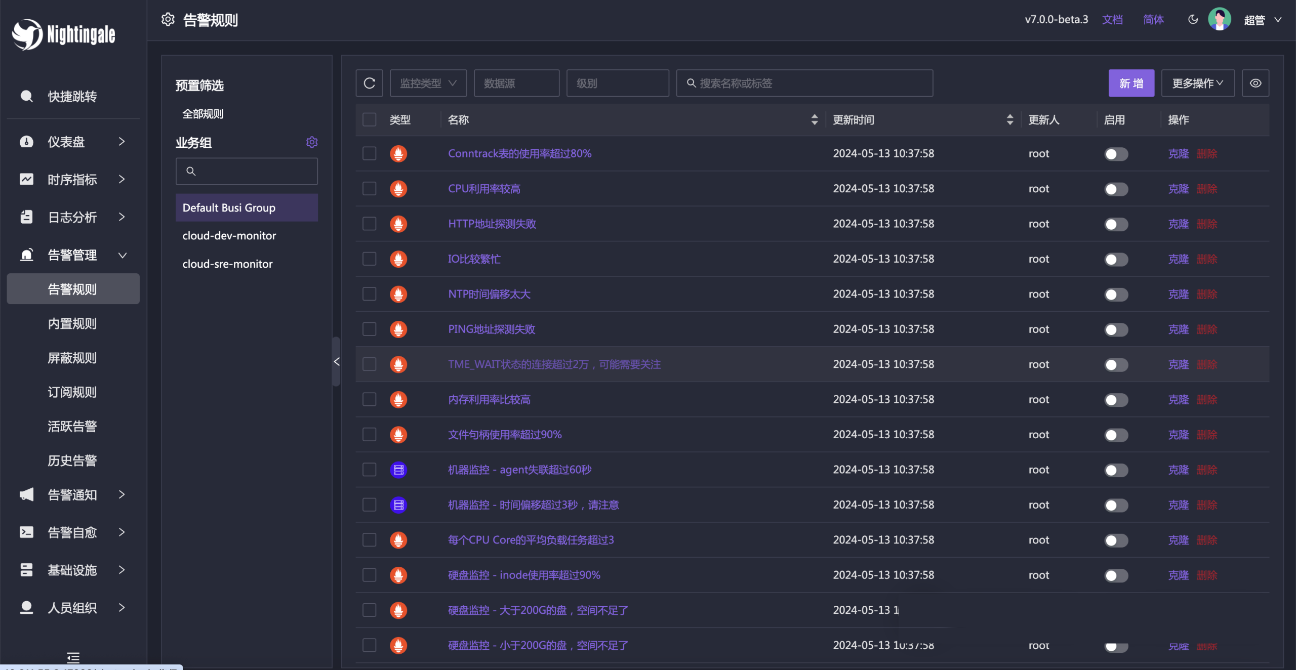除了内置的仪表盘,也内置了很多告警规则,开箱即用。