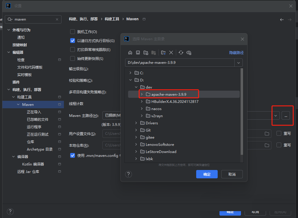 3. 配置maven 文件 – 设置 – 左上角搜索框输入maven – 选择maven安装目录