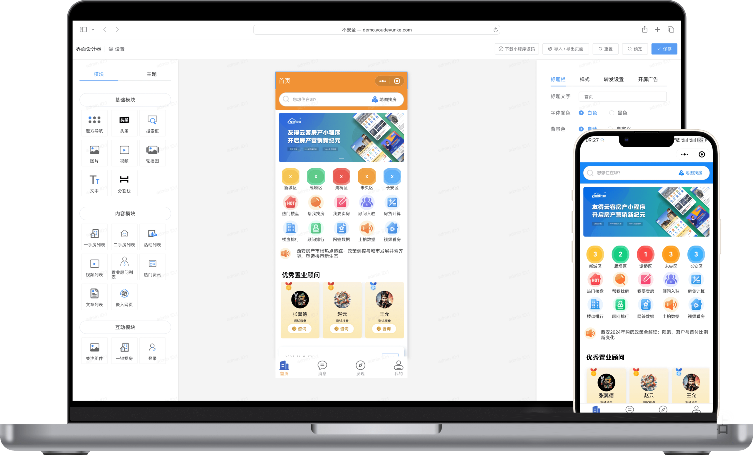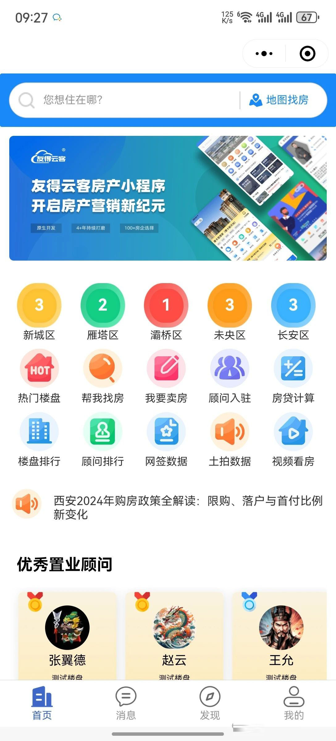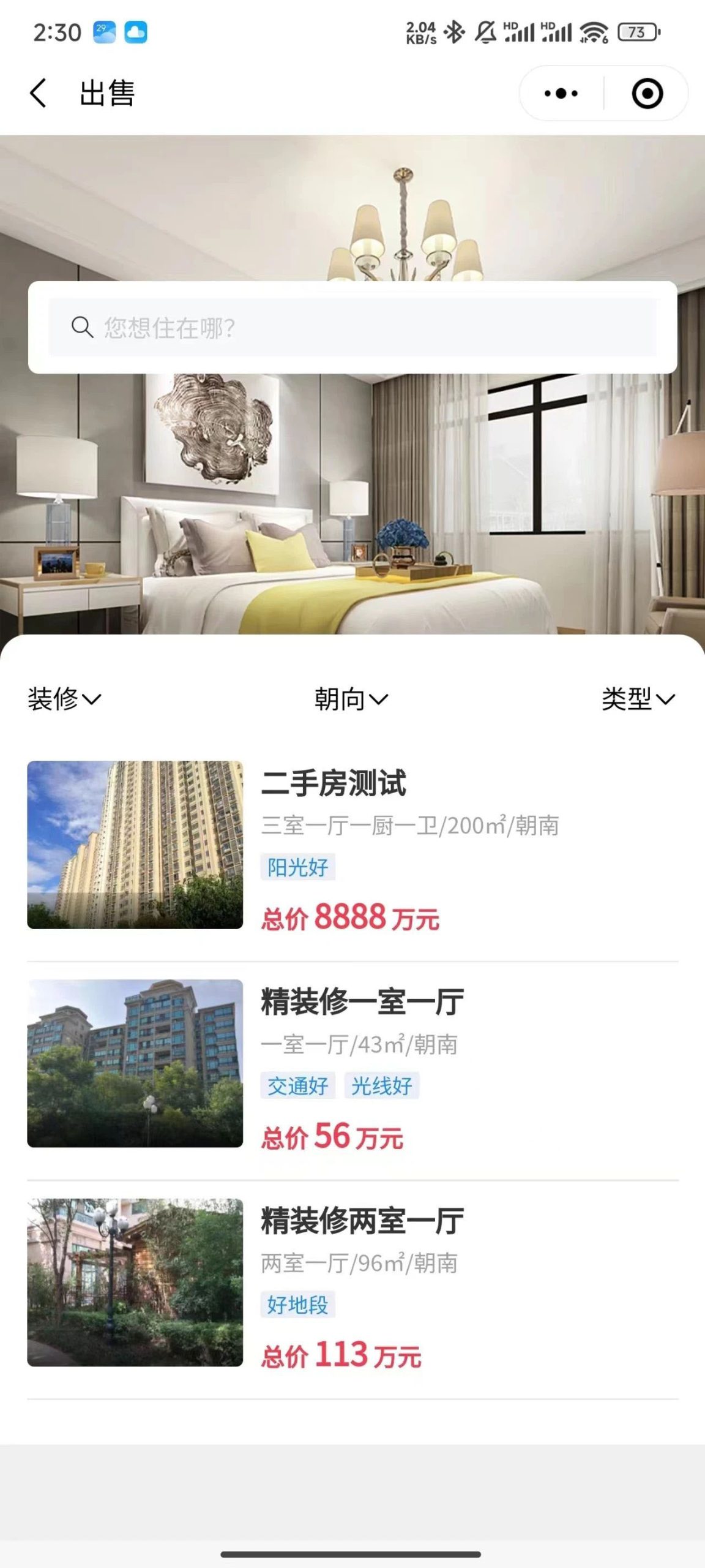 友得云客房产小程序是一款专为房产行业打造的的线上营销获客小程序,功能包括:一手房、二手房、租房房源发布、二维码海报、置业顾问电子名片,适用于房产开发商、代理商、房产自媒体等行业,拥有众多成功案例。前端采用微信小程序原生开发,后端采用java开发,您可以在此基础上进行修改和扩展,以适应您自己的业务。