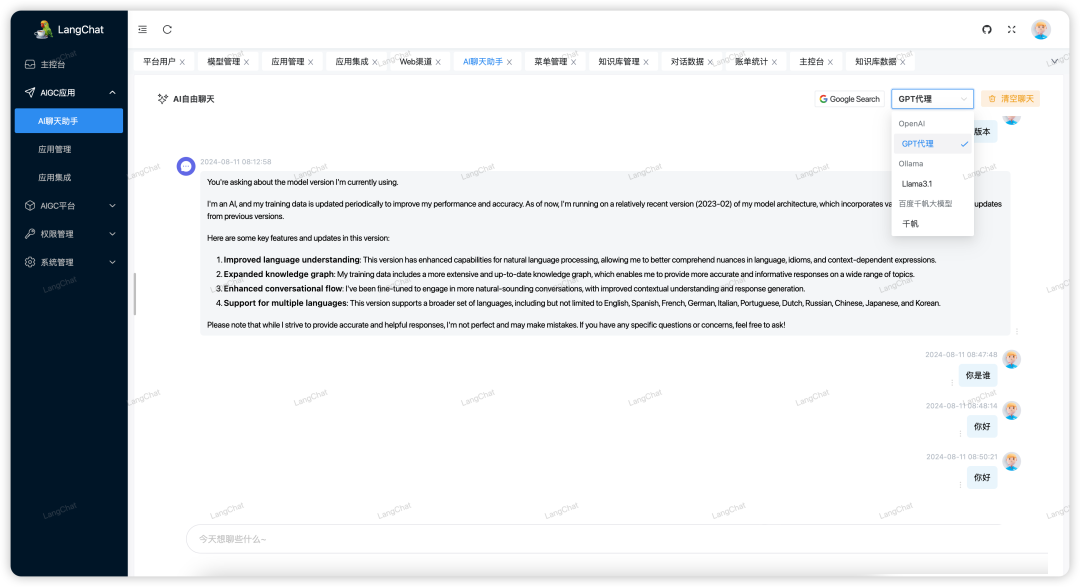 - 多渠道发布:计划封装Web SDK,将AI智能客服快速嵌入任意第三方Web应用中;计划支持微信、飞书、钉钉等消息通信渠道(待完善)