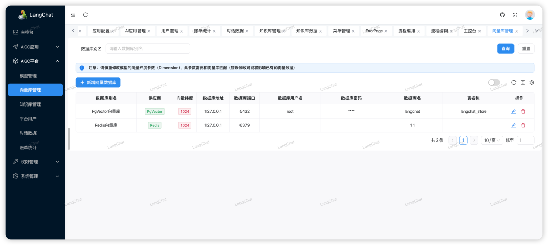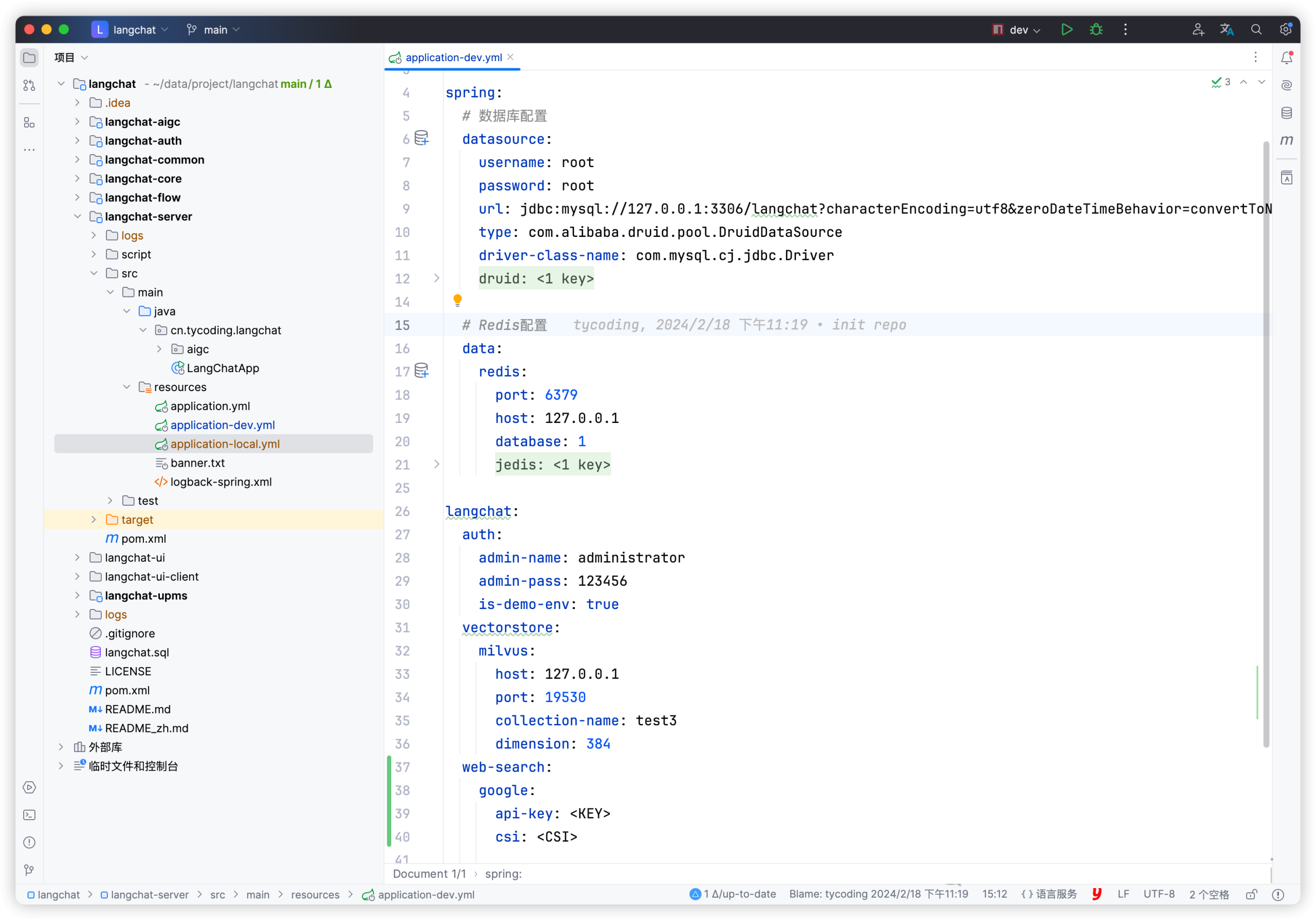 mysql、redis信息 langchat.auth定义了后台管理系统超级管理员账号的登录信息,is-demo-dev为是否开启演示环境langchat.vectorstore定义了LLM向量库的信息,目前LangChat采用PgVector向量数据库langchat.web-search.google定义了谷歌搜索功能的key信息,这个看情况配置
