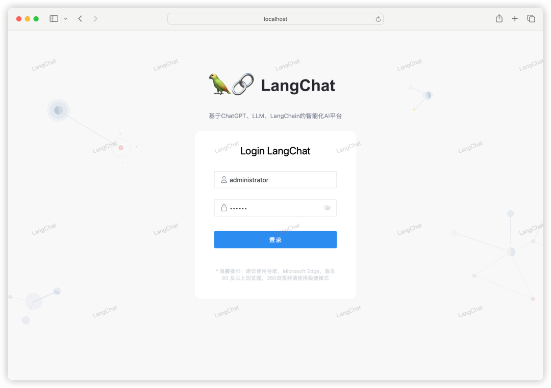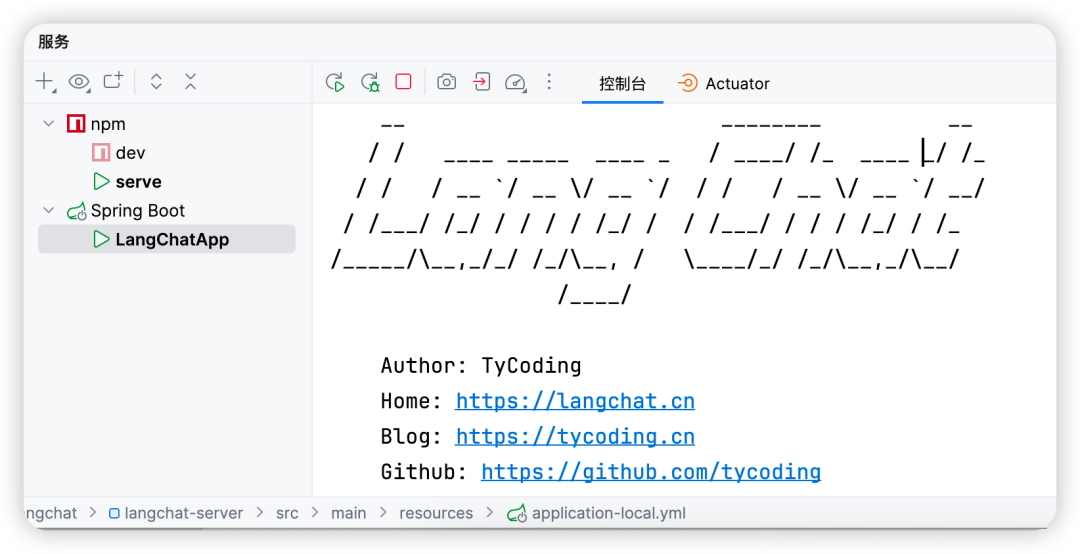 你需要再MySQL8下创建一个名为langchat的数据库,然后在项目根目录找到langchat.sql脚本并导入表结构