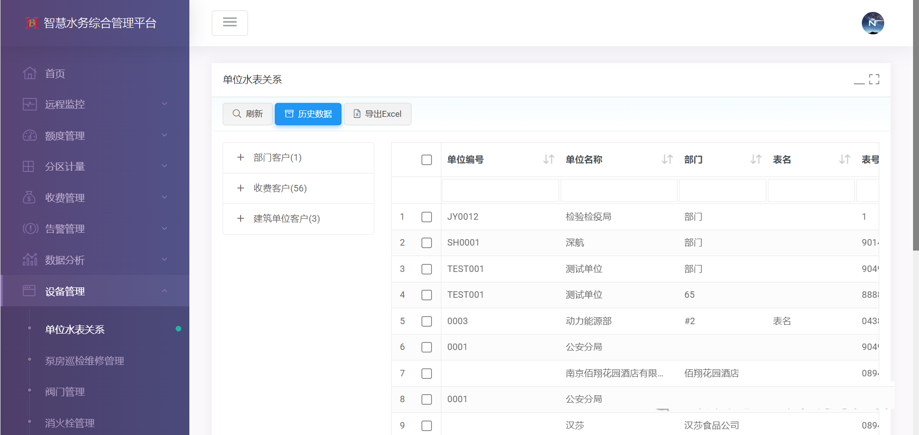 设备管理:单位水表关系、泵房巡检维修管理、阀门管理、消火栓管理、单位管理、拓扑结构数据、拓扑结构图。