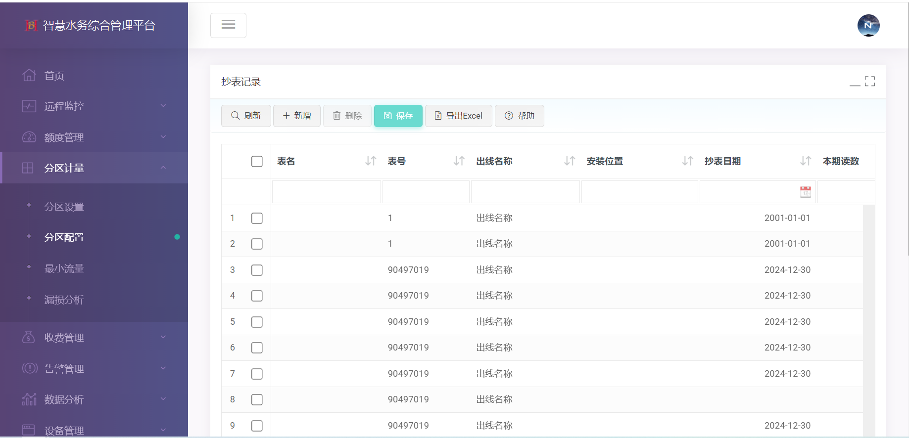 分区计量:分区设置、分区配置、最小流量、漏损分析。