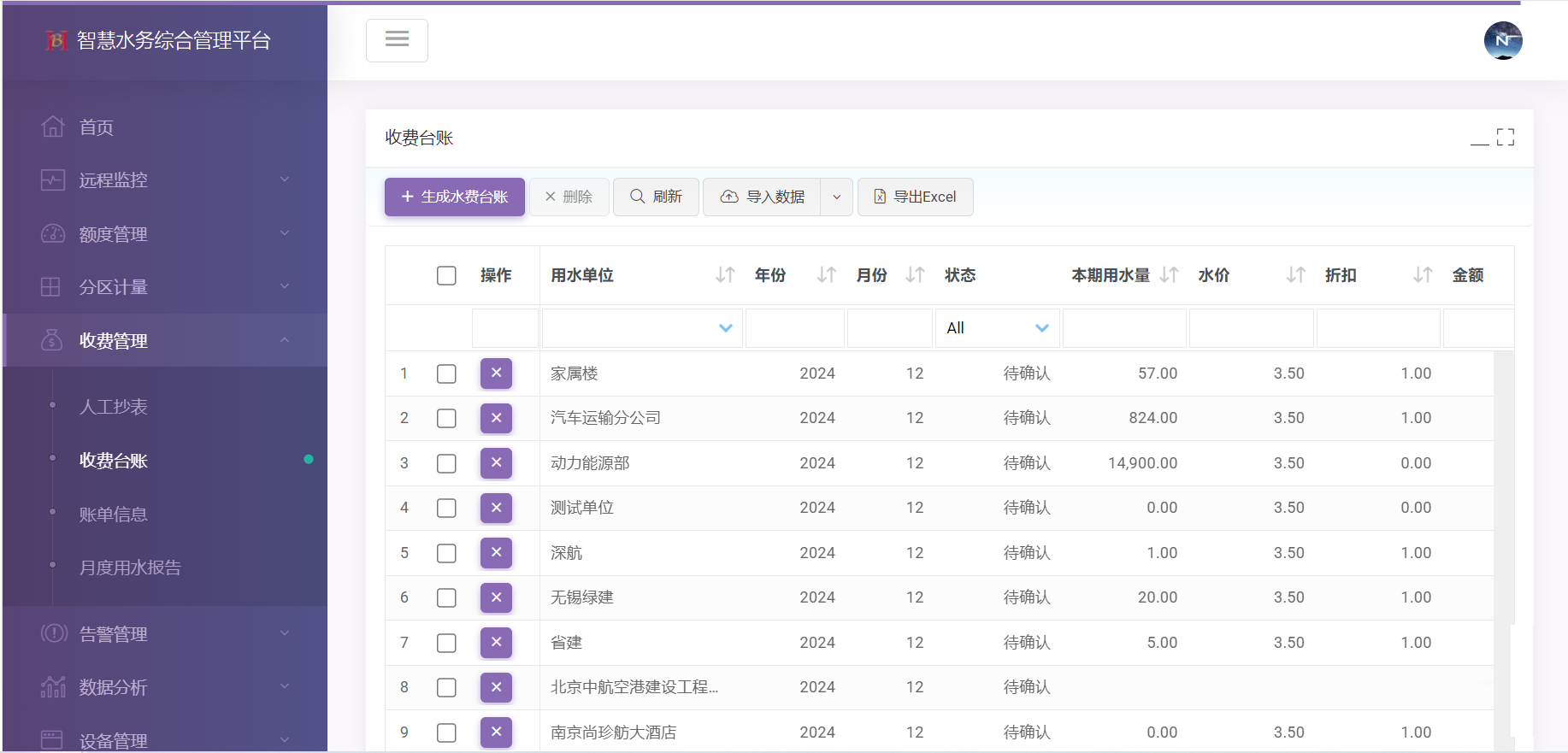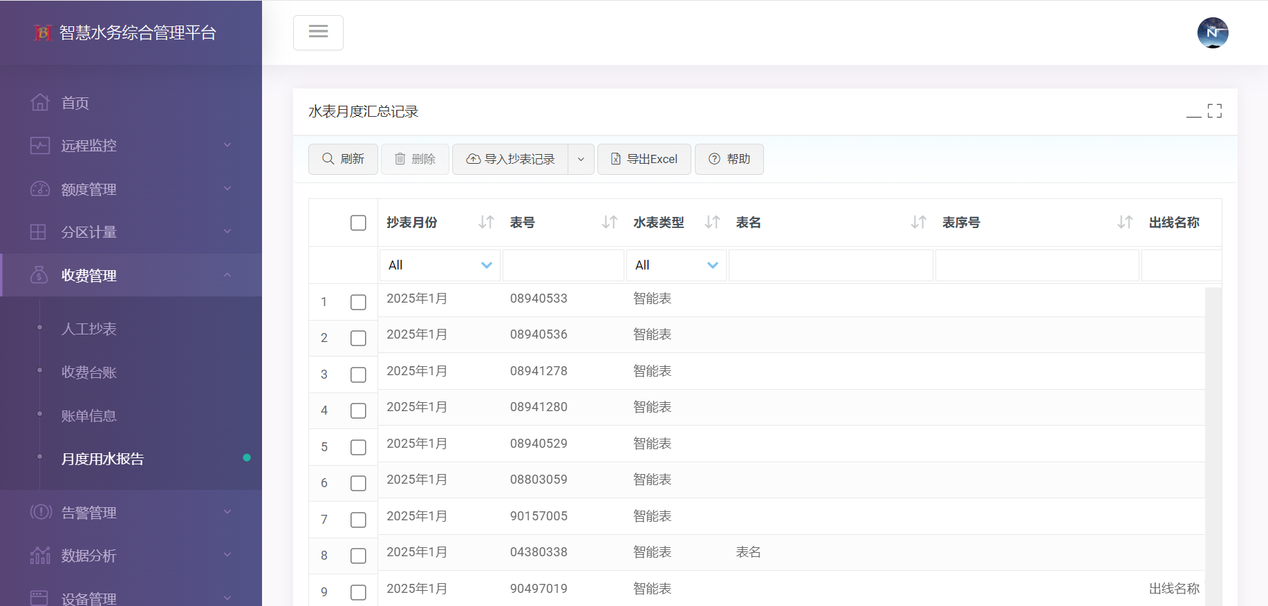 收费管理:人工抄表、收费台账、账单信息、月度用水报告。