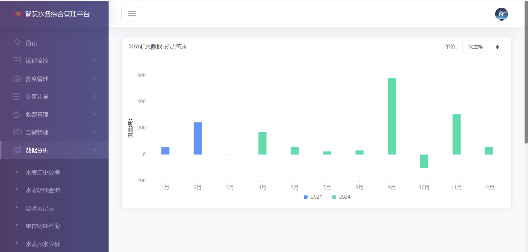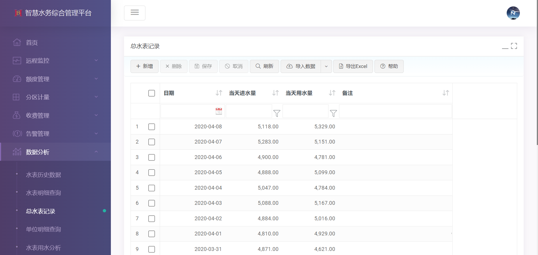 数据分析:水表明细查询、总水表记录、单位明细查询、水表用水分析、分组汇总分析、单位用水分析、用水量同比分析、智能水表统计分析、最小流量分析。